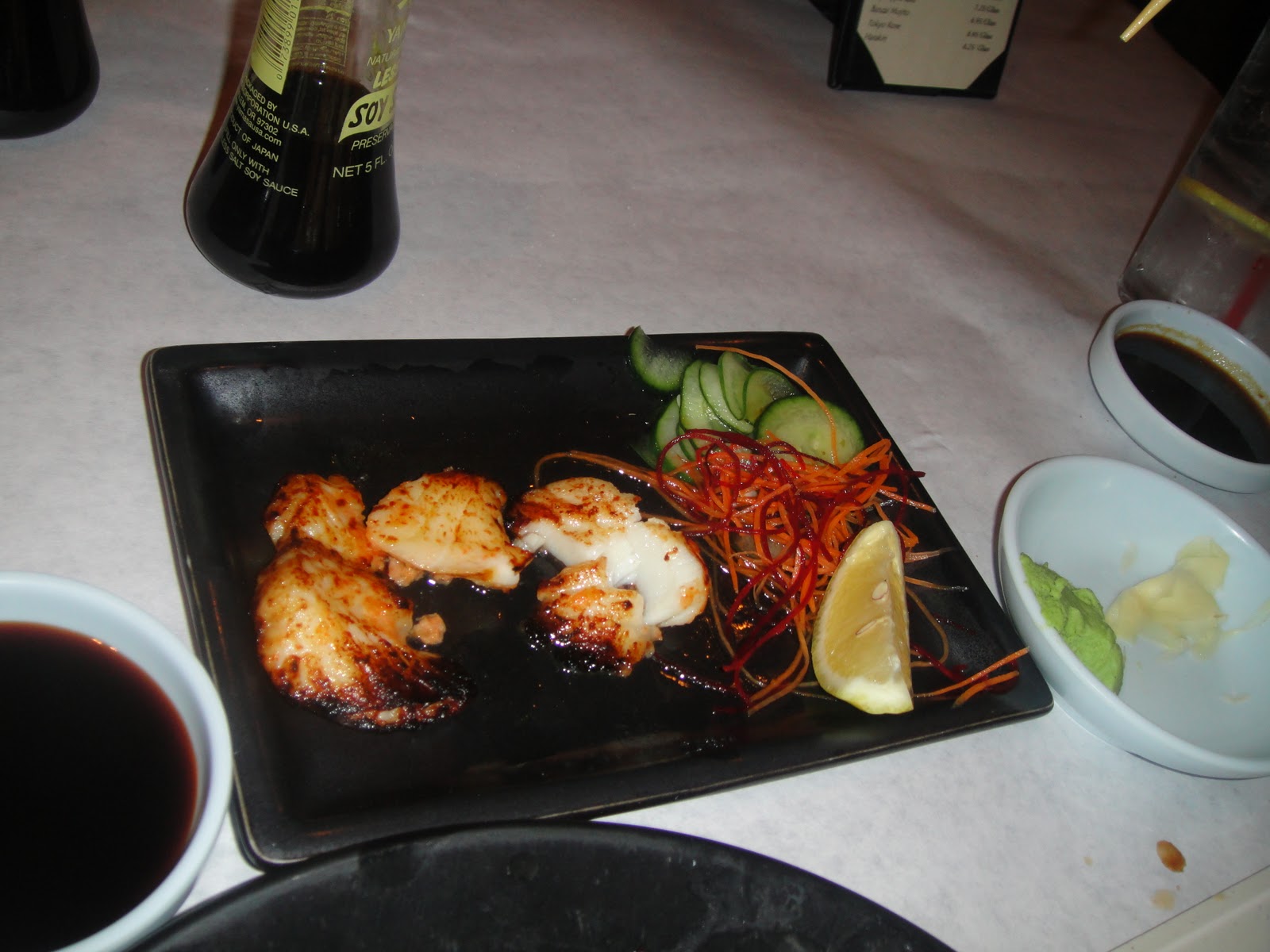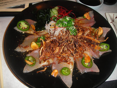 This is my classic roll I get from Bonzai everytime. I also love Banzai’s Lobster Dynamite Roll. It’s heavy, but spicy and so good. I usually always order the Spicy Tuna on Rice Cake, they have a great one, but this time I didn’t. We got the Special Albacore Sashimi with jalepenos, garlic and fried onions in ponzu sauce, and also the Sea Bass appetizer which is freshly grilled in a miso sauce. (The picture below is half eaten lol, sorry!)