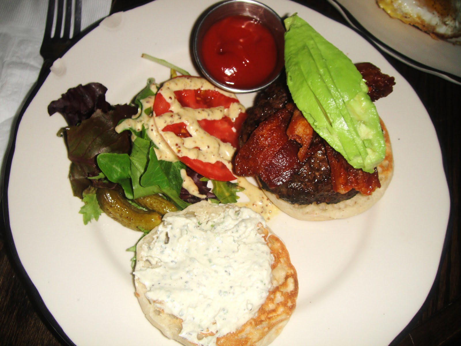 Now, the burgers. The meat is super thick and cooked medium rare. I got mine with goat cheese, applewood smoked bacon and avocado with aoili. The other burger had grilled onions, gruyere, and a fried egg. Also ordered a mix of sweet potato and regular fries for the side. The burgers were great. Juicy and BIG. It was hard to take a bite out of it because the meat was so thick, and one of the best parts about their burgers which makes them unique, is the bun is actually a crispy, buttery English Muffin! I’ve never had a burger with an English Muffin as the bun, but it was actually amazing and genius! Sometimes buns are too thick and heavy, and it takes away from the meat. That’s why an English Muffin is perfect because it doesn’t over power the meat and everything else, and it’s not too “bready”. I loved it.