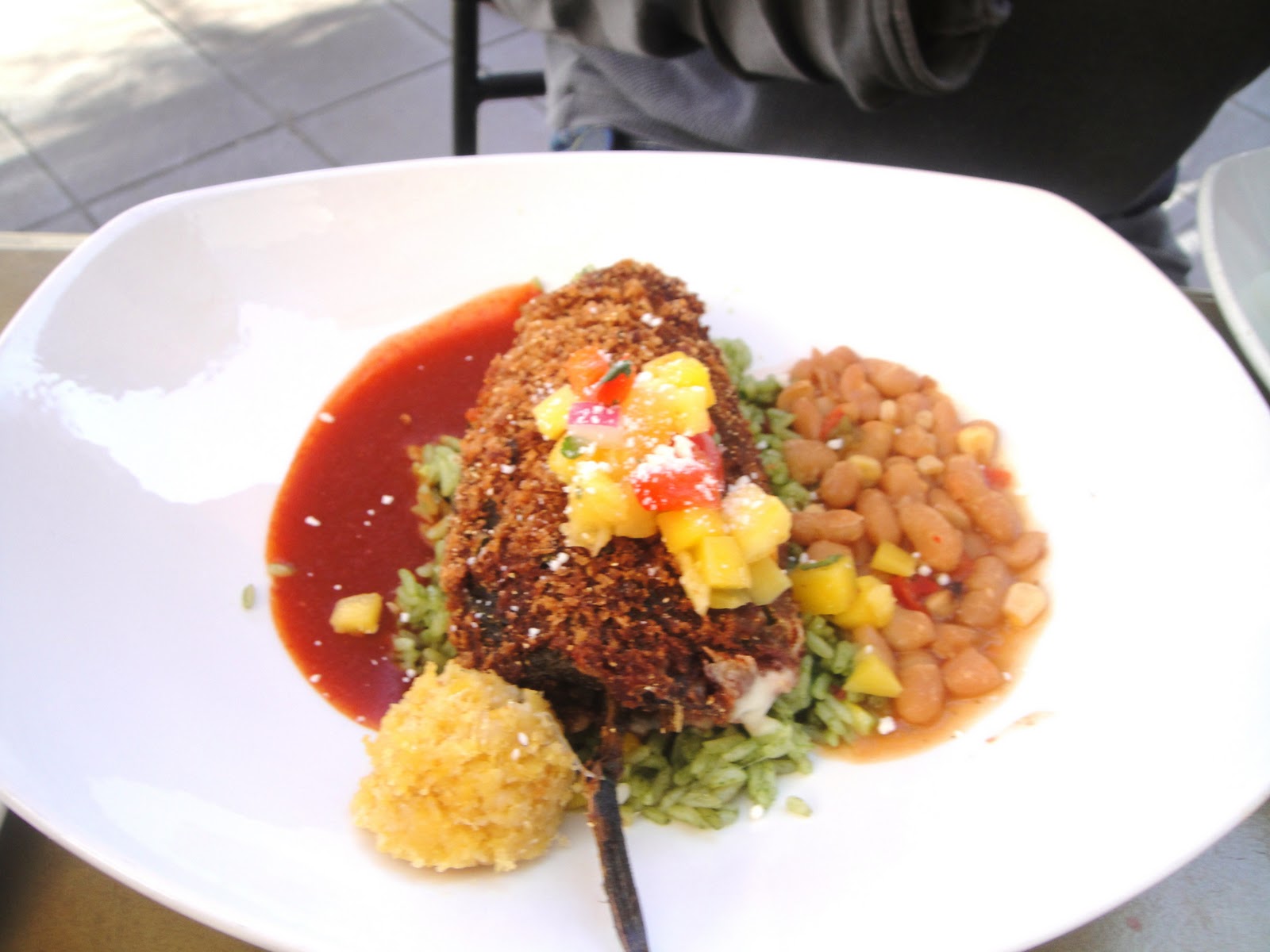 goat cheese, red chile sauce, pineapple-mango salsa, peruvian beans, pasilla-cilantro rice, sweet corn cake