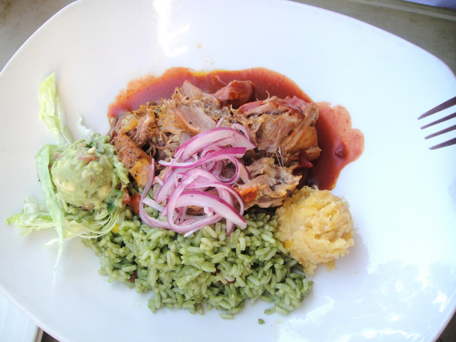 Slow-roasted garlic, achiote, lime and orange marinated pork, citrus-habanero marinated red onions, peruvian beans, pasilla-cilantro rice, fresh avocado relish, sweet corn cake