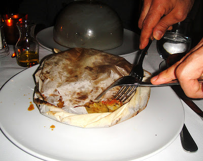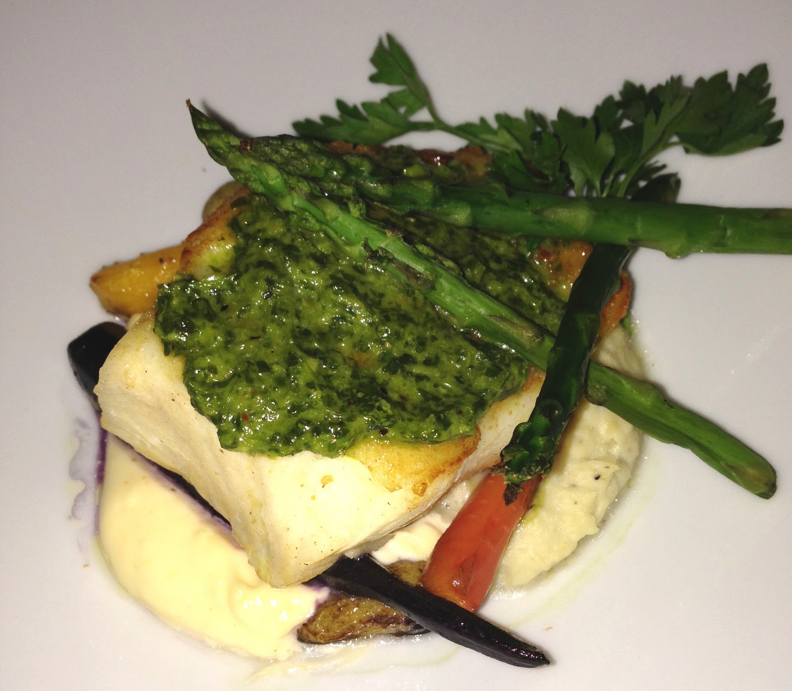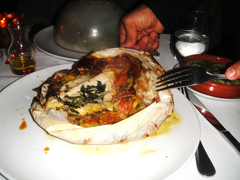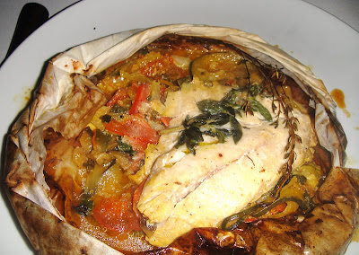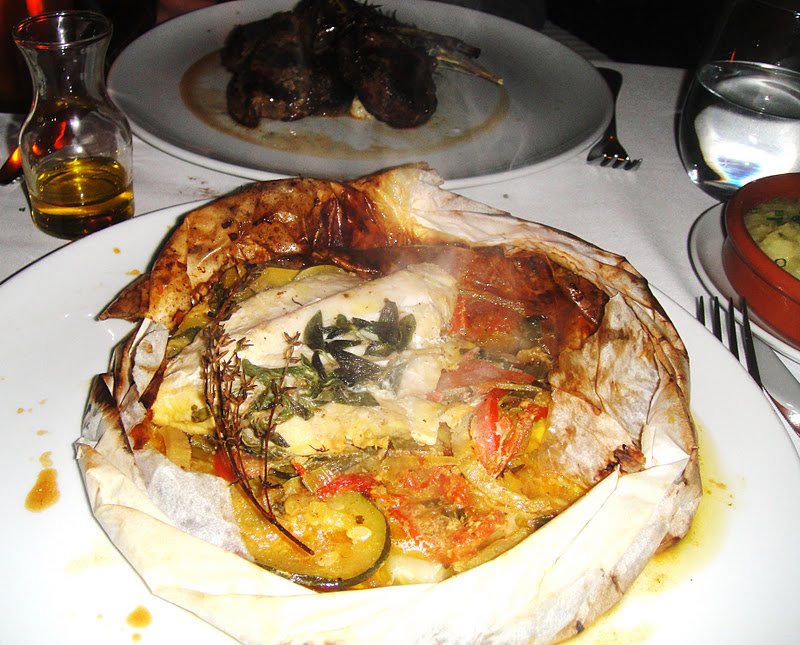 Steamed striped bass filet in papillote with zucchini, eggplant, fennel, tomato, thyme, scallion, saffron served with olive oil mashed potato & chives – Arbequina Olive Oil