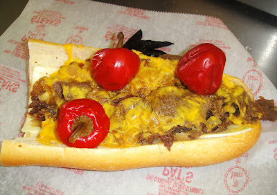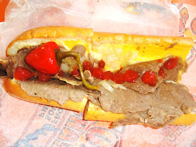 Added some ketchup and peppers at the condiment bar. Geno’s was also good, but not as good as Pat’s. The steak was a little cold, and didn’t have as much flavor. Geno’s had more cheese than Pat’s, which the cheesier the better for me, but it wasn’t mixed in with the meat like at Pat’s. This tasted more like a grilled cheese sandwich, rather than a cheeseteak…the steak got lost with the cheese and bread. Pat’s won because I simply liked the meat better.