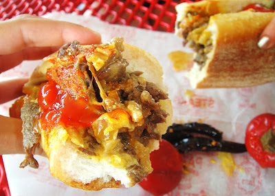 Added some ketchup and peppers at the condiment bar. Geno’s was also good, but not as good as Pat’s. The steak was a little cold, and didn’t have as much flavor. Geno’s had more cheese than Pat’s, which the cheesier the better for me, but it wasn’t mixed in with the meat like at Pat’s. This tasted more like a grilled cheese sandwich, rather than a cheeseteak…the steak got lost with the cheese and bread. Pat’s won because I simply liked the meat better.