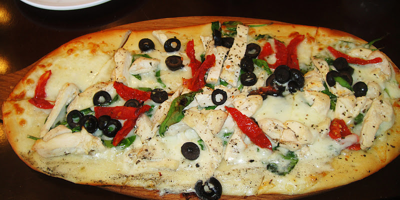 PIZZA W/ CHICKEN, SUN DRIED TOMATOES, BLACK OLIVES, BASIL, & GOAT CHEESE
