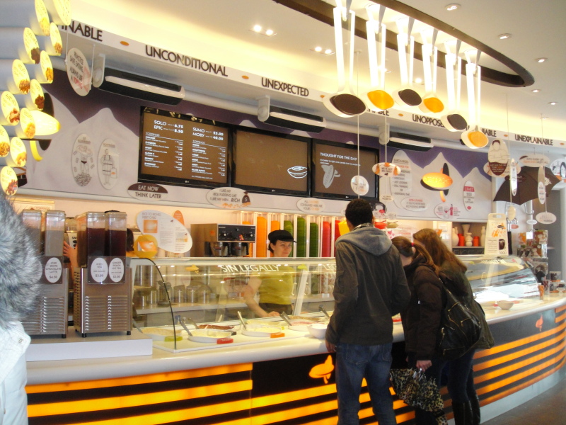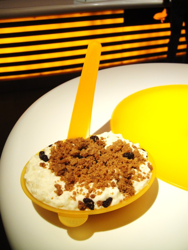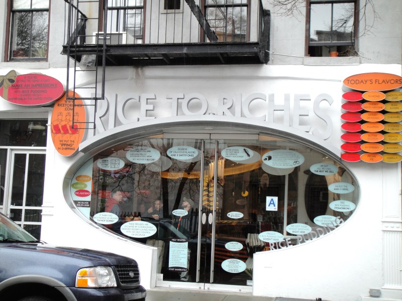 But in New York City, it’s not frozen yogurt that’s popular. It’s RICE PUDDING! Rice pudding places have been popping up everywhere in NYC, and it’s replacing the “Fro-Yo” craze. The most popular and famous rice pudding place in the city is a place called RICE TO RICHES. Inside this place looks like an ice-cream shop with all different kinds of rice pudding flavors, and a wall of yummy toppings to choose from. I had fun sampling all the different and unique flavors- my favorites were “French Toast”, “Cookie’s and Cream” and the regular “Vanilla”. I decided to order the Vanilla rice pudding, with graham cracker cookie crumble and brown sugar with raisins as a topping. Let met me just tell you, it was AMAZING. It’s served in a plastic “UFO” looking saucer with weird spoons—the whole theme of the place is cool- it has a “futuristic” and trendy vibe which was unique.
