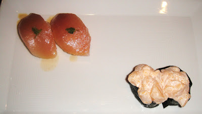 This was my favorite sushi of the night. The yellowtail and halibut and a crisp citrus marinate. Both melted in your mouth. I especially love halibut because of its tenderness. Both such great fishes, and because its such good quality fish the light sauces on them were just enough. Perfection!