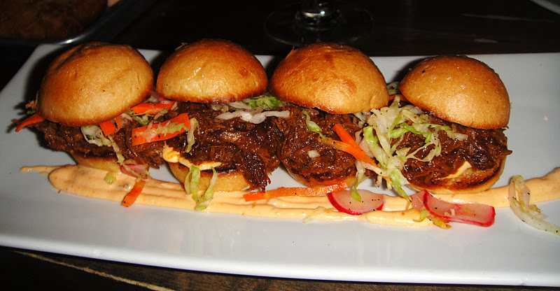THE PEASANT MINIS-4 MINI BURGERS, SLOW ROASTED PULLED BEEF, SPICY CARROTS, PICKLED RED ONIONS, CABBAGE & HOUSE SAUCE